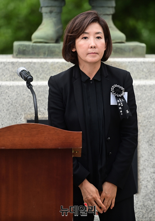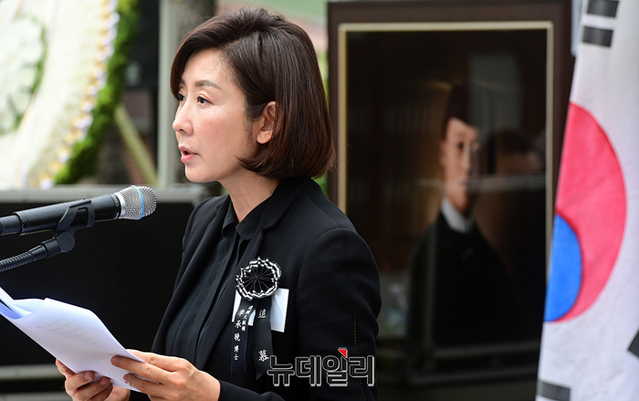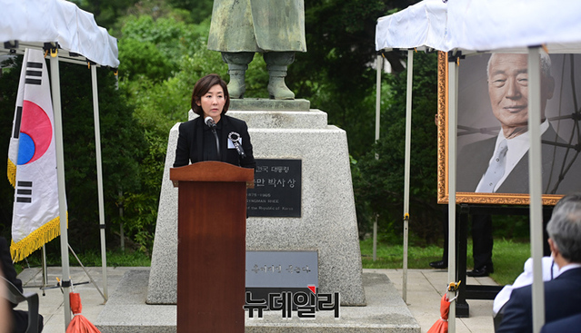 [포토] 우남 이승만 서거 56주기 추모식, 한미상호방위조약 담화문 낭독하는 나경원