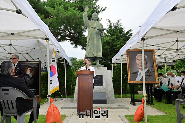 이인호 전 KBS이사장이 11일 오후 서울 종로구 이화장에서 열린 건국대통령 우남 이승만 서거 56주기 추모식에서 추모사를 하고 있다.