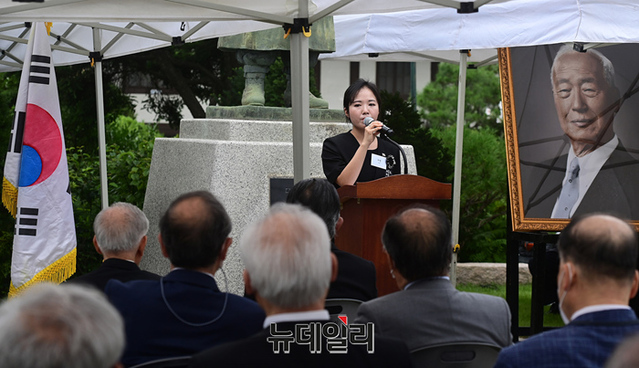 여명 서울시의원이 11일 오후 서울 종로구 이화장에서 열린 건국대통령 우남 이승만 서거 56주기 추모식에서 '대통령 할아버지께'를 제목으로 헌사하고 있다.
