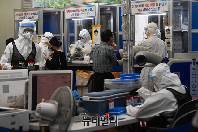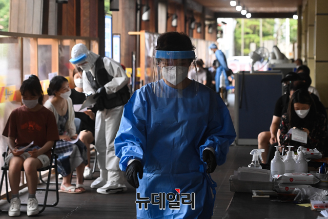 사회적 거리두기가 4단계로 격상돼 시행된 12일 오후 서울 송파보건소를 찾은 시민들이 검체검사를 받기 위해 줄을 서 있다. 중앙방역대책본부는 12일 0시 기준으로 신규 확진자가 1,100명 늘어, 누적 확진자수는 16만 9천 146명이라고 밝혔다.사회적 거리두기 4단계에서는 사적모임이 오후 6시 이전에는 4인, 이후에는 2인까지 허용된다. 학원, 헬스장, PC방, 식당·카페 등 다중이용시설은 오후 10시까지 운영된다. 1인시위를 제외한 모든 집회는 금지된다. 12일부터 시행되는 4단계는 25일까지 이어진다.문재인 대통령은 이날 오후 청와대에서 열린 수도권 특별방역점검회의에서 "또다시 국민들께, 조금 더 참고 견뎌내자고 당부드리게 되어 대단히 송구한 마음 금할 수 없다"고 말했다.