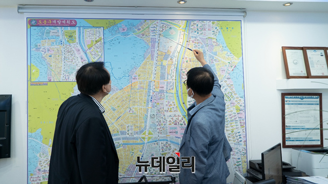 윤석열 전 검찰총장이 13일 서울 도봉구 한 부동산을 방문해 중개인과 만나 개발계획도를 살펴보고 있다. (사진=윤석열캠프)