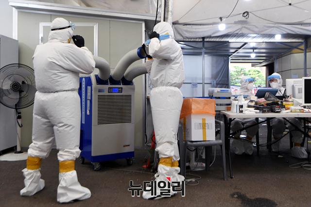 30도를 웃도는 무더위가 계속된 13일 서울 송파구보건소에 마련된 선별진료소에서 의료진이 냉풍기로 더위를 식히고 있다. 13일 확진자는 국내 1,907명과 해외유입 53명으로 1,150명 발생했다. 일주일째 1,000명 이상 네 자릿수를 기록하고 있다.