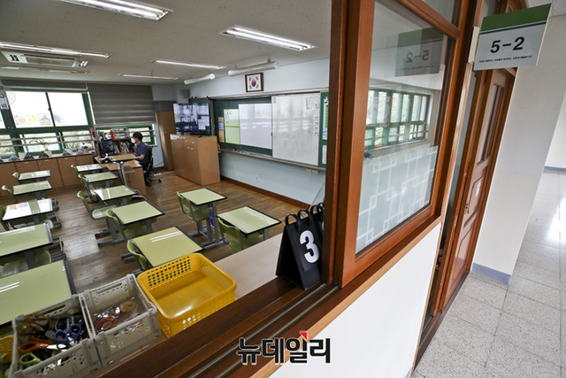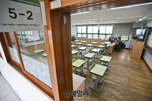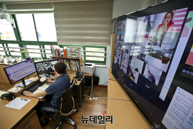사회적 거리두기 4단계 시행으로 수도권 학교 수업이 전면 원격수업으로 전환된 14일 서울 성동구 무학초등학교에서 5학년 교사가 원격수업을 진행하고 있다.