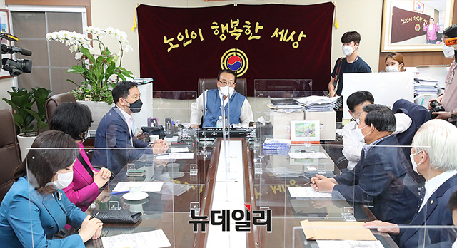 김기현 국민의힘 원내대표가 13일 서울 용산구 대한노인회 중앙회를 방문해 김호일 대한노인회장과 대화하고 있다. (사진=국민의힘)