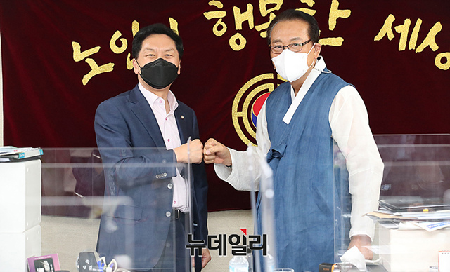[포토] 인사 나누는 김기현 원내대표와 김호일 대한노인회장