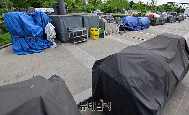 최근 새 단장한 성남시 모란시장 오일장터에 14일 오전 상인들이 싸둔 수레가 모여있다. 이날은 장이 설 예정이었지만 거리두기 4단계로 격상되면서 24일까지 임시휴장에 들어갔다. 오일장을 찾은 시민들은 휴장 소식에 아쉬워하며 발걸음을 돌렸다.