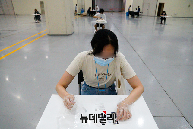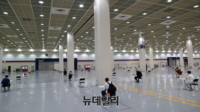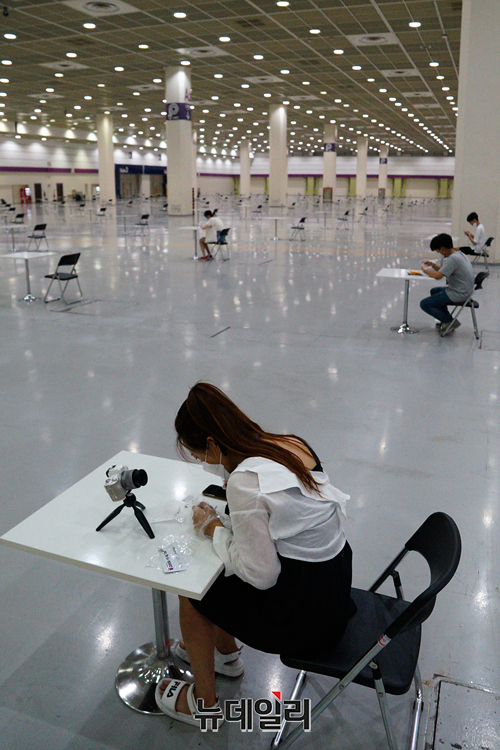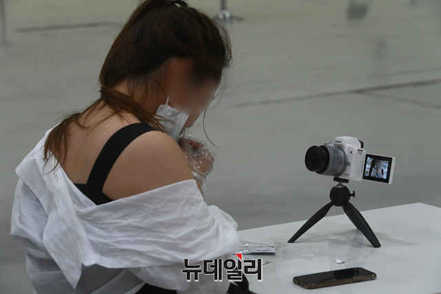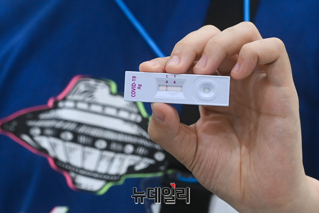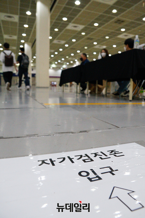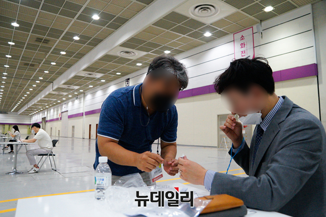 '2021 서울커피엑스포'를 찾은 관람객들과 참가 기업직원들이 14일 오후 서울 강남구 코엑스에 별도로 마련된 자가검진존에서 '코로나19 자가 진단 키트'를 이용해 검사를 받고 있다.