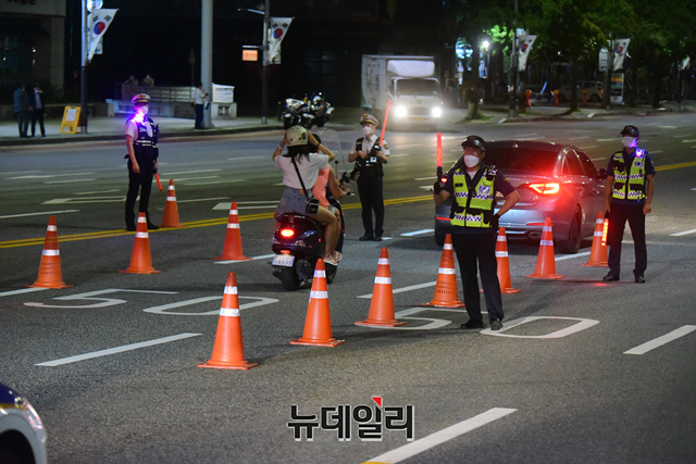 코로나19 대응 전국자영업자비상대책위원회의 거리두기 4단계 조치 항의 심야 차량 시위가 예정된 14일 오후 국회 앞에서 경찰이 차량에 대한 검문을 하고 있다.