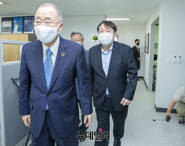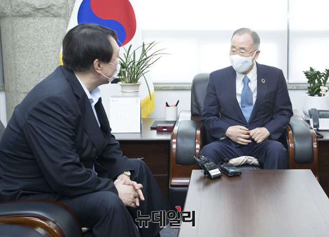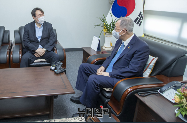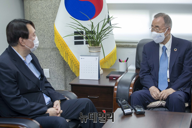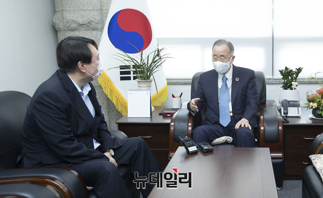 야권 대권주자인 윤석열 전 검찰총장(왼쪽)이 15일 오전 서울 종로구 반기문재단에서 반기문 전 UN사무총장을 예방해 환담을 나누고 있다. (사진=공동취재단)