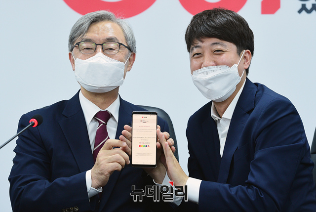 이준석 국민의힘 대표가 15일 서울 여의도 국민의힘 당사에서 열린 최재형 전 감사원장의 입당원서를 작성한 최재형 전 감사원장의 핸드폰을 들어보이고 있다. (사진=공동취재단)