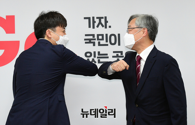 최재형 전 감사원장이 15일 서울 여의도 국민의힘 당사를 찾아 이준석 대표와 인사를 나누고 있다. (사진=공동취재단)