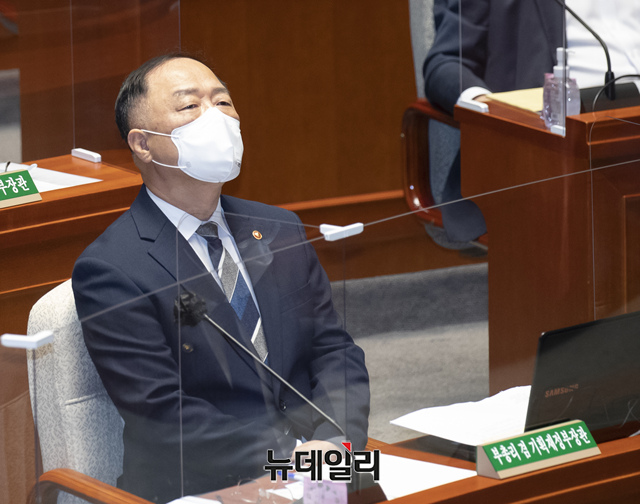 홍남기 부총리 겸 기획재정부 장관이 15일 오전 국회에서 열린 예산결산특별위원회 전체회의에서 의원들 질의를 듣고 있다. (사진=공동취재단)