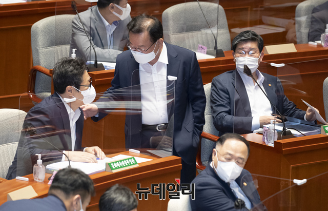 김부겸 국무총리가 15일 오전 국회에서 열린 예산결산특별위원회 전체회의에서 황희 문화체육관광부 장관과 대화를 하고 있다. (사진=공동취재단)