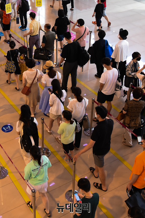 수도권 사회적 거리두기 4단계 첫 주말을 앞둔 16일 오후 김포공항 국내선 출발선에서 탑승객들이 수속을 위해 줄을 서 있다.
