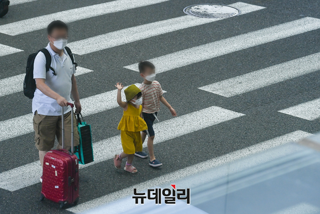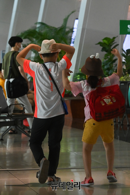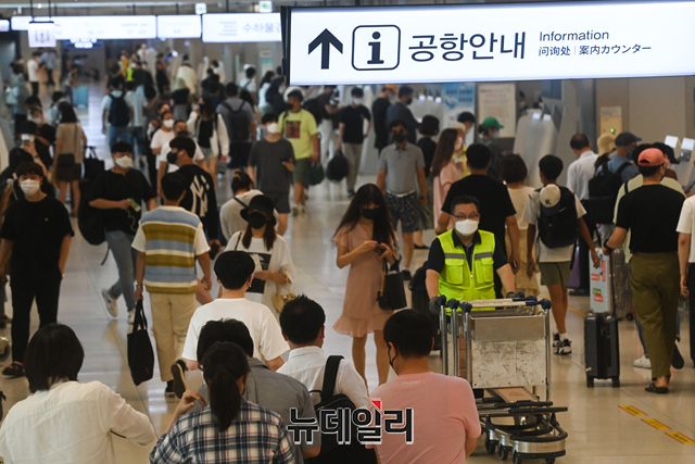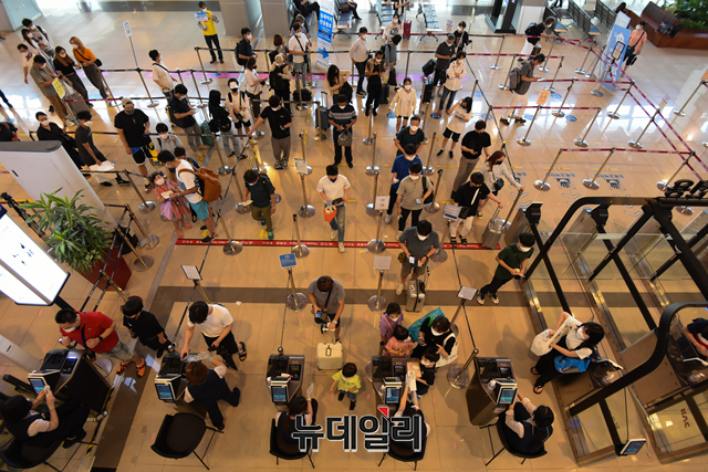 [포토] 거리두기 4단계 첫 주말...여행객으로 붐비는 김포공항