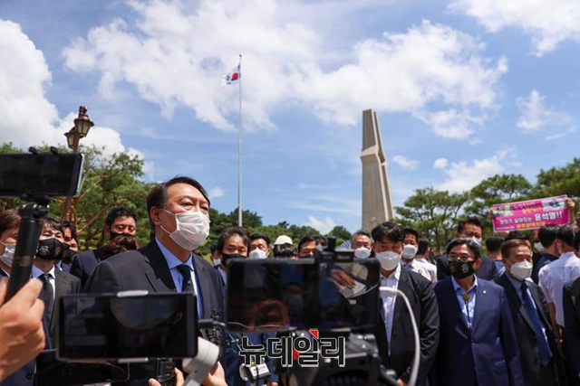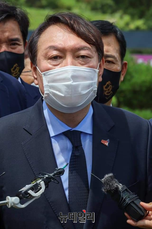 대선 출마를 선언한 윤석열 전 검찰총장이 17일 오전 광주 북구 국립 5·18민주묘지 참배를 마치고 기자들의 질문에 답하고 있다. (사진=윤석열캠프)