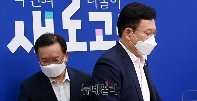 송영길 더불어민주당 대표와 김부겸 국무총리가 19일 오전 국회에서 열린 고위당정협의회의에 입장하고 있다. (사진=공동취재단)