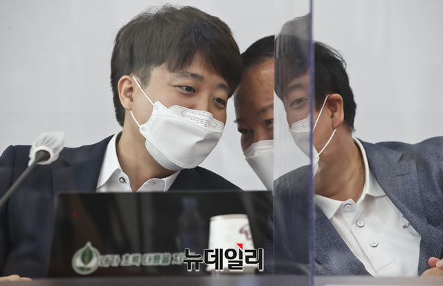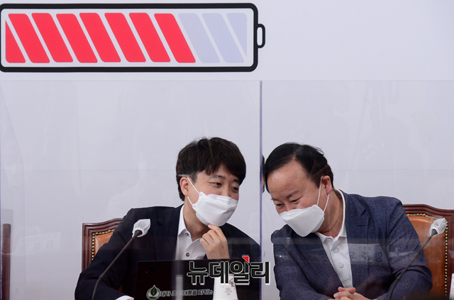 이준석 국민의힘 대표가 19일 오전 국회에서 열린 최고위원회의에서 김재원 최고위원과 대화를 나누고 있다. (사진=공동취재단)