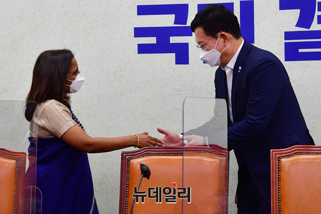 송영길 더불어민주당 대표가 19일 국회에서 스리프리야 란가나탄 주한인도대사를 접견하고 있다. (사진=공동취재단)