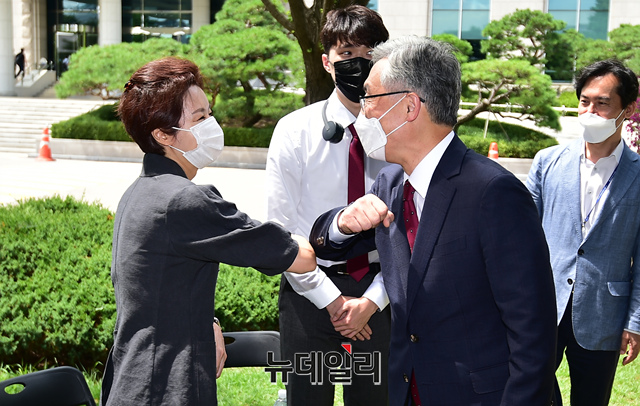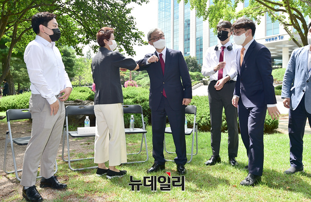 [포토] 국민의힘 대변인단과 인사 나누는 최재형 전 감사원장
