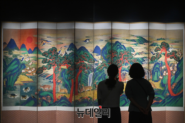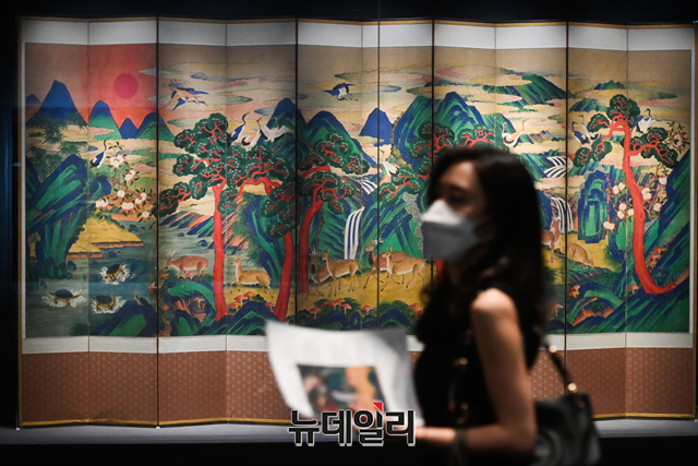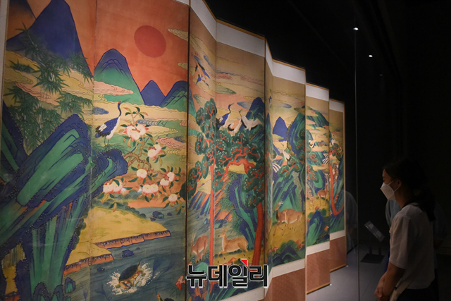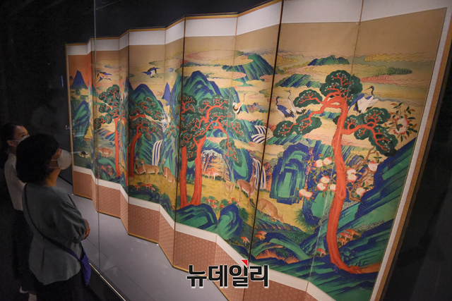 '위대한 문화유산을 함께 누리다 고(故) 이건희 회장 기증 명품전시' 언론공개회가 20일 오전 서울 용산구 국립중앙박물관 상설전시관에서 열린 가운데 참석자들이 조선시대 채색장식화 '십장생도 10폭 병풍' 전시품을 살펴보고 있다.