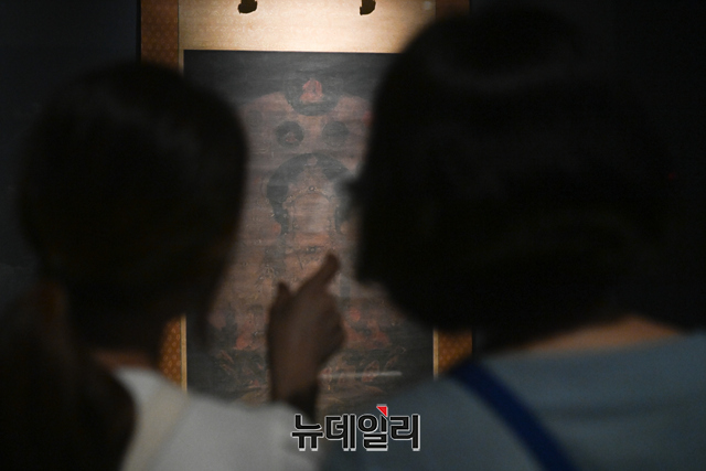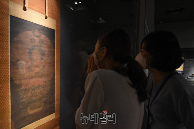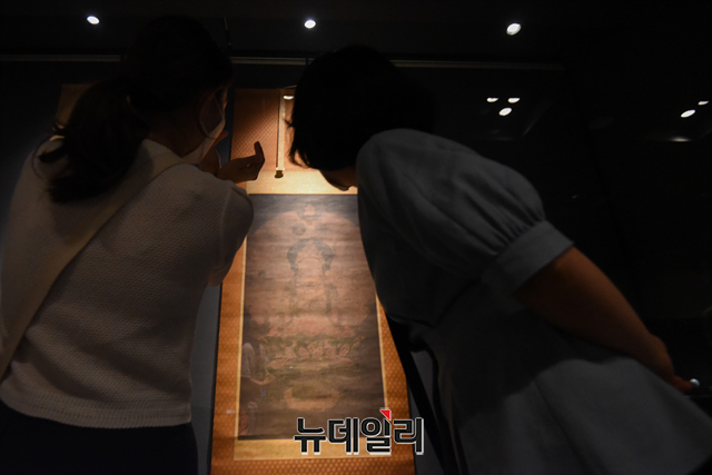 '위대한 문화유산을 함께 누리다 고(故) 이건희 회장 기증 명품전시' 언론공개회가 20일 오전 서울 용산구 국립중앙박물관 상설전시관에서 열린 가운데 참석자들이 국외에서 환수한 '수월관음도'를 살펴보고 있다.