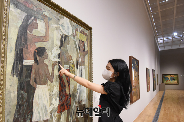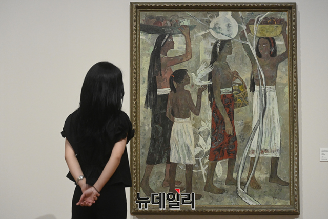 'MMCA 이건희 컬렉션 특별전: 한국미술명작' 언론공개회가 서울 종로구 국립현대미술관에서 열린 가운데 참석자들이 박항섭 화백의 '가을'을 살펴보고 있다.