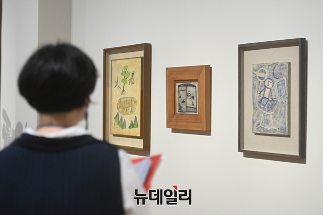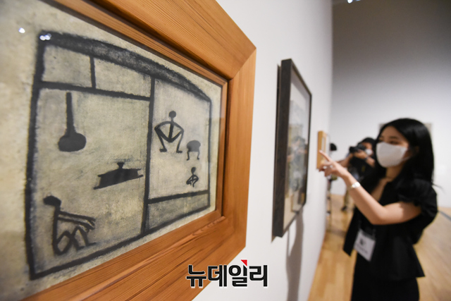 'MMCA 이건희 컬렉션 특별전: 한국미술명작' 언론공개회가 서울 종로구 국립현대미술관에서 열린 가운데 참석자들이 장욱진 화백의 '부엌과 방' 등의 작품을 관람하고 있다.