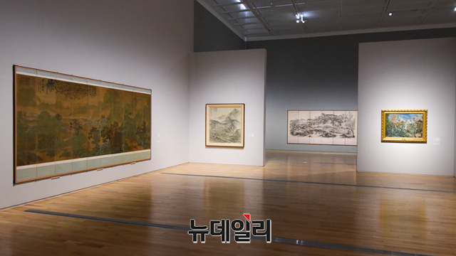 'MMCA 이건희 컬렉션 특별전: 한국미술명작' 언론공개회가 서울 종로구 국립현대미술관에서 열린 가운데 참석자들이 작품을 관람하고 있다.