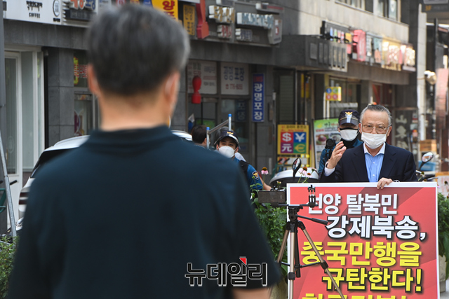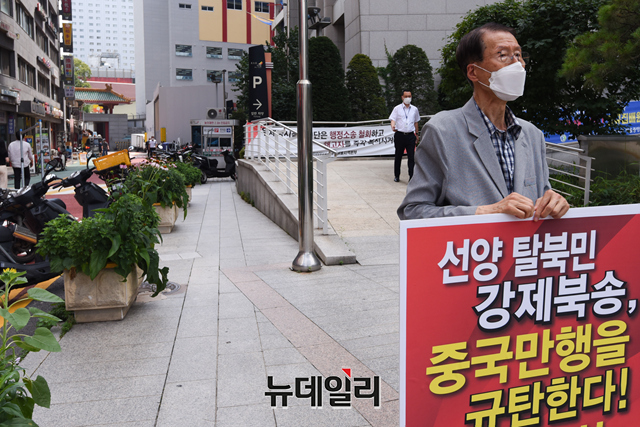 김태훈 한변 상임대표가 20일 오전 서울 중구 중국대사관 인근에서 진행된 '제120회차 화요집회 1인 시위'에서 중국 선양에 구금중이던 탈북민 50여 명을 강제 북송에 관련해 진상규명을 촉구하고 있다.