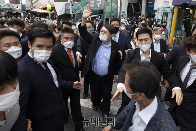 대선 출마를 선언한 윤석열 전 검찰총장이 20일 오후 대구 중구 서문시장에서 상인들과 만나고 나오며 기다리던 지지자들에게 손을 들어 화답하고 있다. 윤 전 총장은 이날 2.28기념탑 참배를 시작으로 대구를 방문해 서문시장, 동성로, 동산병원, 창조경제혁신센터 등을 방문했다. (대구=정상윤 기자)