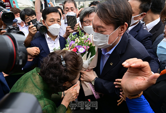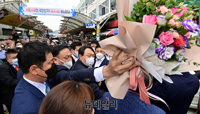 대선 출마를 선언한 윤석열 전 검찰총장이 20일 오후 대구 중구 서문시장을 방문해 상인대표에게 꽃다발을 받고 이동하고 있다. 윤 전 총장은 이날 대구를 방문해 2.28기념탑 참배를 시작으로 서문시장, 동성로, 동산병원, 창조경제혁신센터 등을 방문했다. (대구=정상윤 기자)