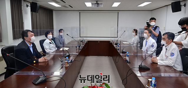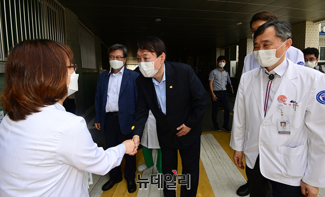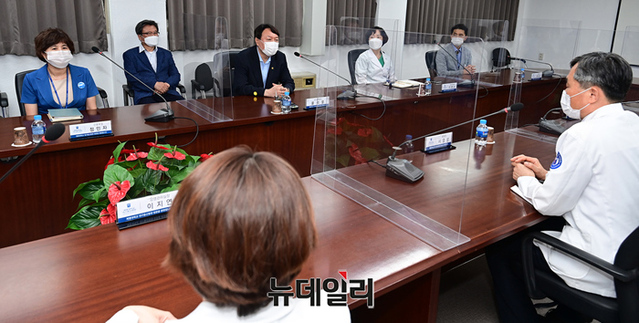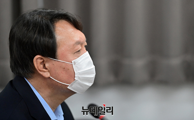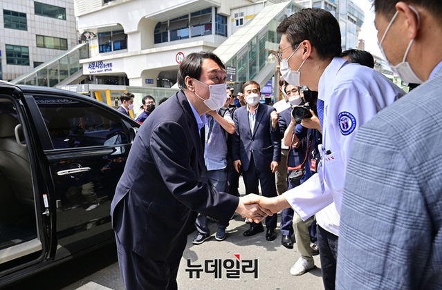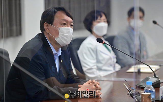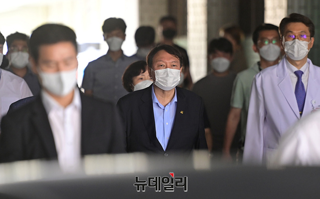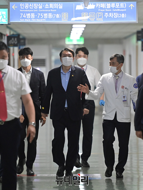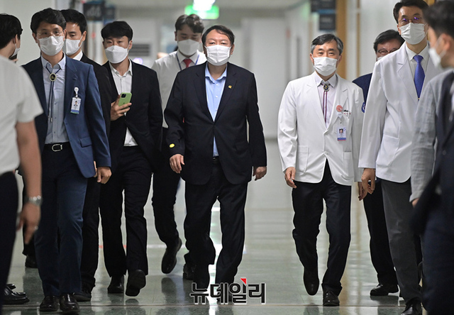 대선 출마를 선언한 윤석열 전 검찰총장이 20일 오후 대구 중구 동산병원을 방문해 서영성 병원장과 간담회를 위해 이동하고 있다. 윤 전 총장은 이날 대구를 방문해 2.28기념탑 참배를 시작으로 서문시장, 동성로, 동산병원, 창조경제혁신센터 등을 방문했다. (대구=정상윤 기자)