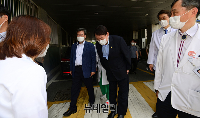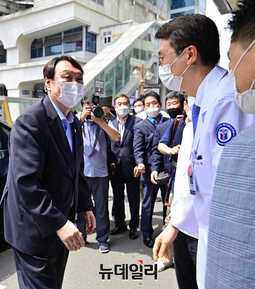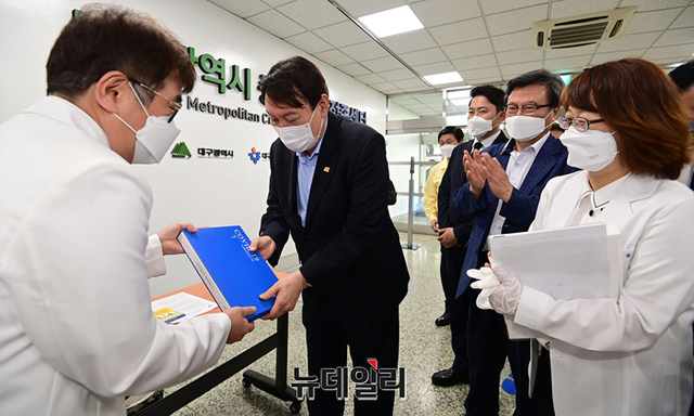 대선 출마를 선언한 윤석열 전 검찰총장이 20일 오후 대구 중구 동산병원을 방문해 병원관계자에게 코로나19 백서를 선물 받고 있다. 윤 전 총장은 이날 대구를 방문해 2.28기념탑 참배를 시작으로 서문시장, 동성로, 동산병원, 창조경제혁신센터 등을 방문했다. (대구=정상윤 기자)
