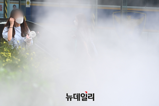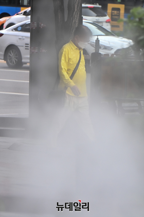 폭염 위기경보가 '경계'단계로 격상된 20일 오후 서울 중구 대사관 인근에 설치된 쿨링포그에서 인공 안개가 분사되고 있다. 기상청은 당분간 내륙을 중심으로 매우 무더운 날씨가 지속될 전망했다.
