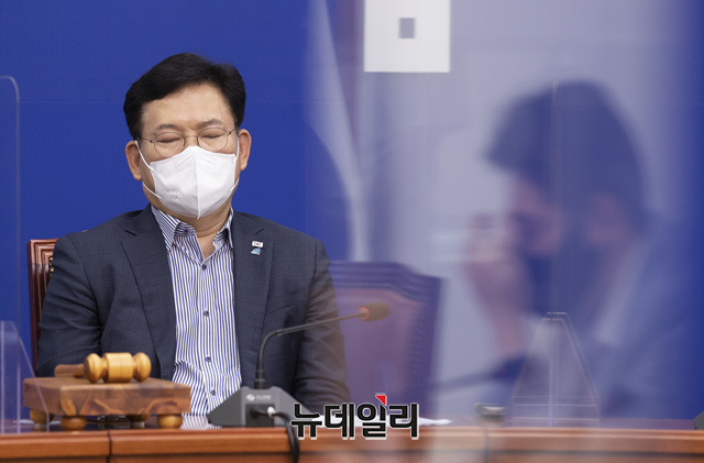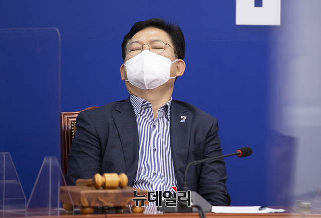 송영길 더불어민주당 대표가 21일 오전 국회에서 열린 최고위원회의에서 눈을 감고 있다. (사진=공동취재단)