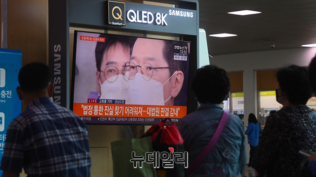 김경수 경남지사가 드루킹 댓글 조작 등의 혐의로 징역 2년의 실형이 확정된 21일 오전 서울 중구 서울역 대합실에서 시민들이 관련 뉴스를 시청하고 있다.