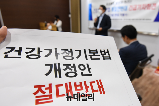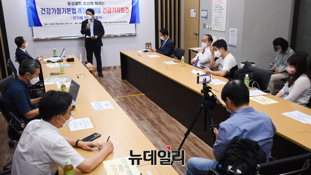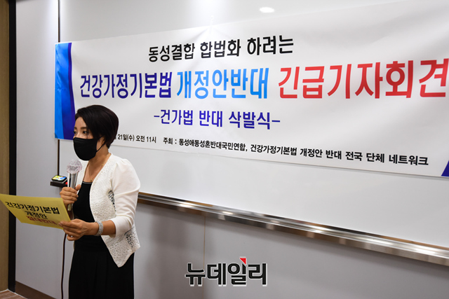 동성애동성혼반대국민연합을 비롯한 시민단체가 21일 오전 서울 중구 서울역 회의실에서 건강가정기본법(건가법) 개정안 반대 긴급 기자회견을 하고 있다.이들은 "건가법 개정안이 국회에 통과할 경우 비혼 동거인을 가족관계등록부에 배우자 대신 동반자로 등록해 남자며느리 또는 여자사위와 한가족이 될 수 있다"며 동성혼 합법화 추진을 규탄하며 삭발식을 진행했다.기자회견에는 김수진 전국학부모단체연합, 길원평 동반연 운영위원장, 원성웅 진평연 상임대표, 박은희 국민희망교육연대 공동대표, 조용식 건강한가정만들기국민운동본부 사무총장, 조우경 다음세대를위한학부모연합대표 등이 참석했다.