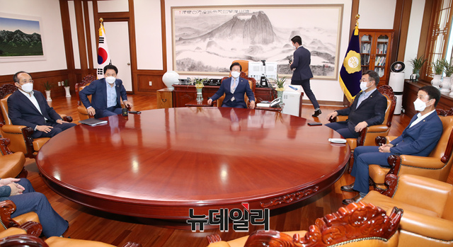 박병석 국회의장이 22일 오후 국회 의장실에서 윤호중 더불어민주당 원내대표와 김기현 국민의힘 원내대표가 회동을 갖고 있다. (사진=공동취재단)