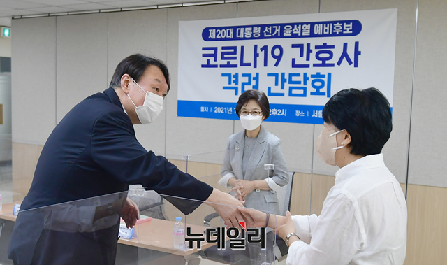 대선 출마를 선언한 윤석열 전 검찰총장이 22일 오후 서울 구로구 서울시간호사회를 찾아 '코로나19 간호사 격려 간담회'를 갖고 간호사들과 인사를 나누고 있다.
