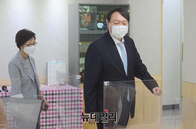 대선 출마를 선언한 윤석열 전 검찰총장과 박인숙 서울시간호사회 회장이 22일 오후 서울 구로구 서울시간호사회를 찾아 '코로나19 간호사 격려 간담회'에 참석하기 위해 입장하고 있다.