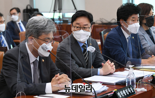 박범계 법무부 장관이 22일 국회에서 열린 법제사법위원회 전체회의에 참석해 김상환 법원행정처장과 대화를 나누고 있다. (사진=공동취재단)