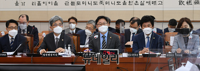 박범계 법무부 장관이 22일 국회에서 열린 법제사법위원회 전체회의에서 의원들의 질의에 답변하고 있다. (사진=공동취재단)