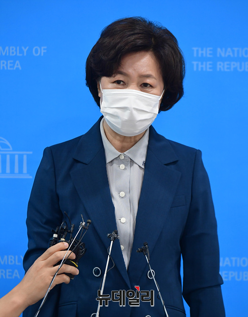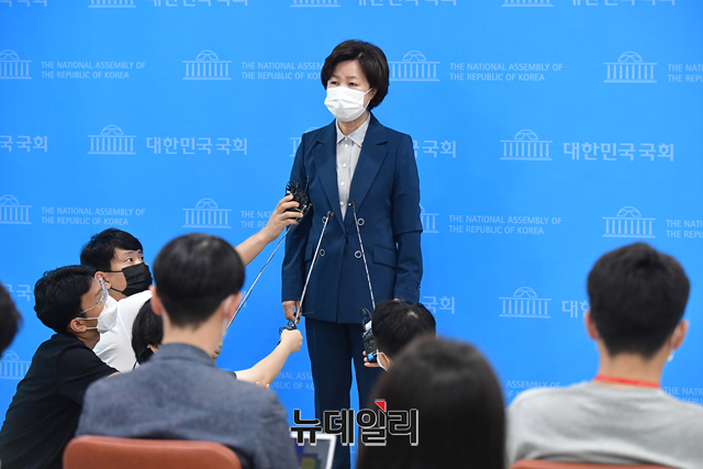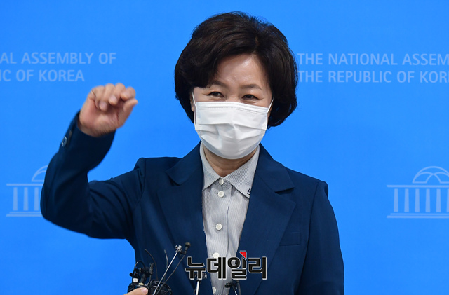대선출마를 선언한 추미애 전 장관이 23일 오전 국회 소통관에서 1호 공약인 토지공개념 관련 기자회견을 미치고 기자들의 질문에 답하고 있다.