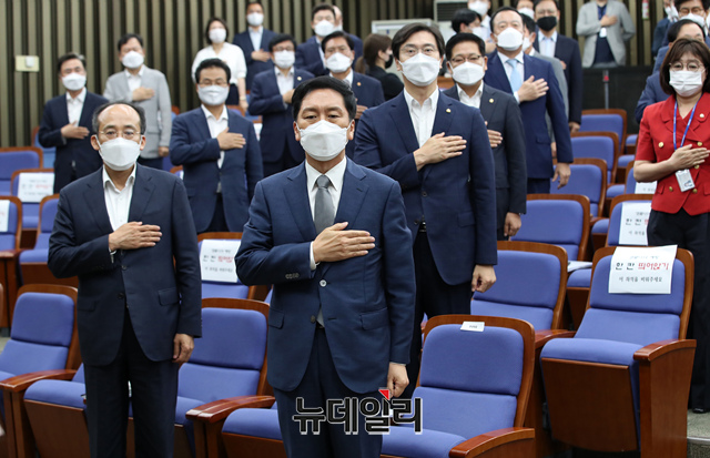 김기현 국민의힘 원내대표 및 소속의원들이 23일 오전 국회에서 열린 의원총회에서 국민의례를 하고 있다. (사진=공동취재단)