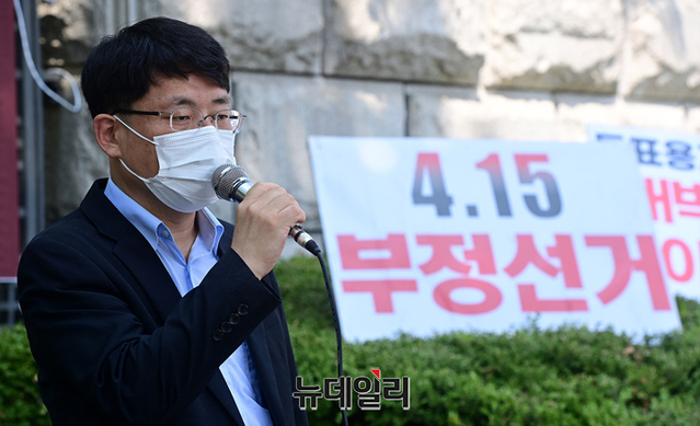 도태우 변호사가 23일 오전 서울 서초구 대검찰청 앞에서 열린 인천 연수을 재검표 관련 투표지 위조 고소 기자회견'에서 손피켓을 들고 있다.