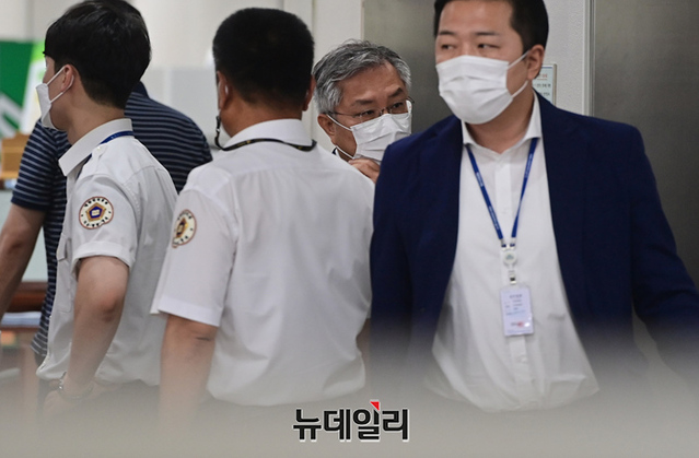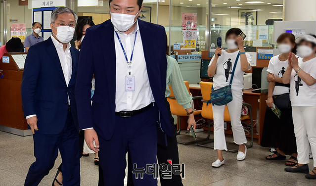 명예훼손 혐의로 재판에 넘겨진 최강욱 열린민주당 대표가 23일 오후 서울 서초구 서울중앙지법에서 열린 공판에 출석하고 있다. 같은 시간 열린 조국 전 법무부 장관의 재판을 기다리던 조 전 장관의 지지자들이 최 대표가 등장하자 손을 흔들며 응원했다.