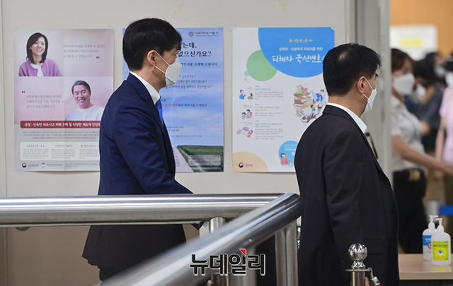 '자녀 입시비리 및 사모펀드 등' 혐의로 기소된 조국 전 법무부 장관이 23일 오후 서울 서초구 서울중앙지법에서 열린 재판에 입장하고 있다.