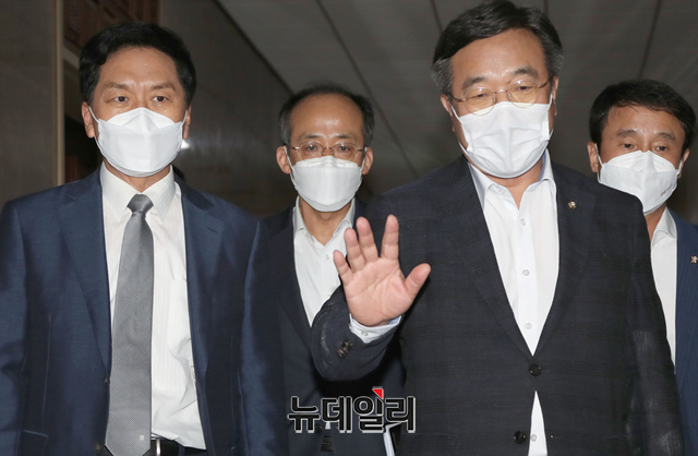 윤호중 더불어민주당 원내대표와 김기현 국민의힘 원내대표가 23일 오후 박병석 국회의장 주재로 회동한 뒤 의장실을 나서고 있다. (사진=공동취재단)