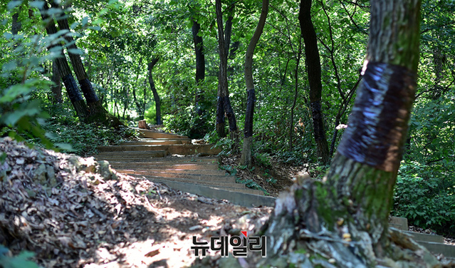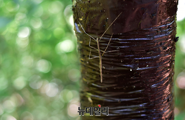 지난해 서울 은평구 봉산 일대에 대규모로 출몰했던 대벌레가 24일 오후 등산로 일대에 쉽게 발견 되고 있다. 대벌레는 봉산 정상으로 갈수록 더 많이 발견된다.대벌레는 대나무 모양을 닮아 이름 붙여졌다. 활엽수를 대량으로 갉아 먹어 산림 미관을 해치는 경우가 많다. 성충은 7~10cm까지 자란다. 대벌레의 대규모 출몰은 최근 겨울철 이상 고온과 천적감소 등이 꼽히고 있다. 은평구는 대벌레 유충 부화시기에 맞춰 등산로 수목에 끈끈이 롤트랩을 설치해 방제작업에 나섰다.은평구 봉산 이외에도 의왕시 청계산과 인근 수락산에도 대벌레가 대규모로 출몰한 것으로 확인됐다.